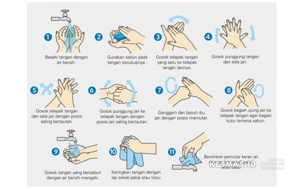 Mencuci tangan harus dilakukan dengan benar. Untuk menghilangkan lemak atau kotoran, tidak cukup hanya dengan bilasan singkat saja. Cuci tangan pakai sabun dengan air bersih mengalir dilakukan minimal selama 40-60 detik untuk melindungi kita dari penyakit. Ikuti langkah-langkah berikut untuk mencuci tangan yang baik dan benar :