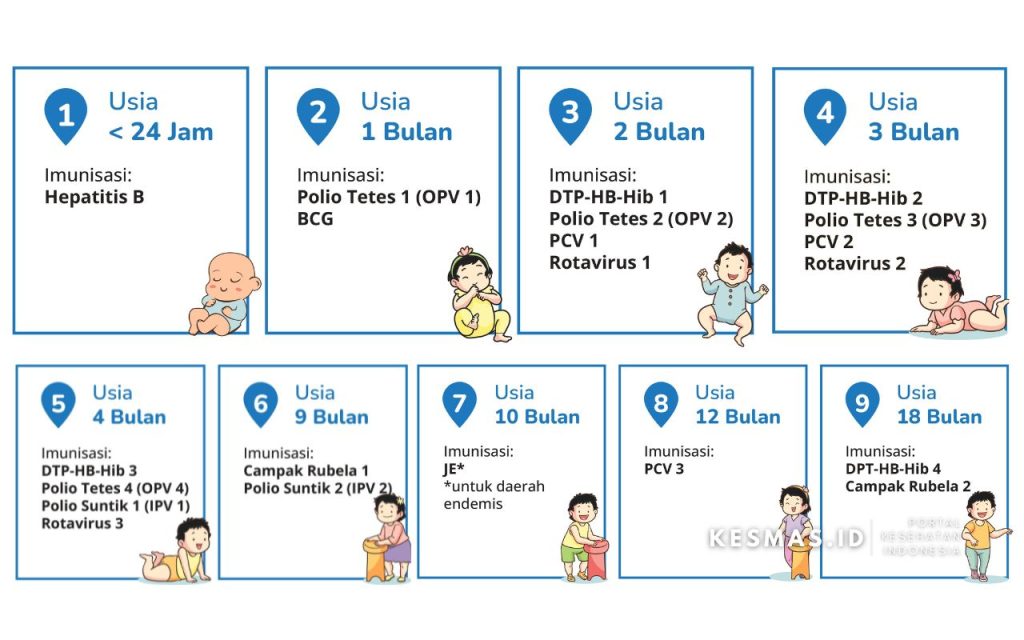 Imunisasi merupakan suatu proses yang terjadi, ketika tubuh membentuk imun atau kekebalan terhadap infeksi penyakit tertentu. Upaya imunisasi umumnya dilakukan untuk pencegahan penyakit yang disebabkan oleh penularan bakteri maupun virus. Penyakit menular bisa menyerang siapa saja, terlebih pada bayi yang daya tahan tubuhnya lebih rentan. Oleh karenanya, pemerintah telah menyiapkan program Imunisasi Dasar Lengkap, untuk melindungi bayi dan anak-anak dari bahaya infeksi penyakit menular.