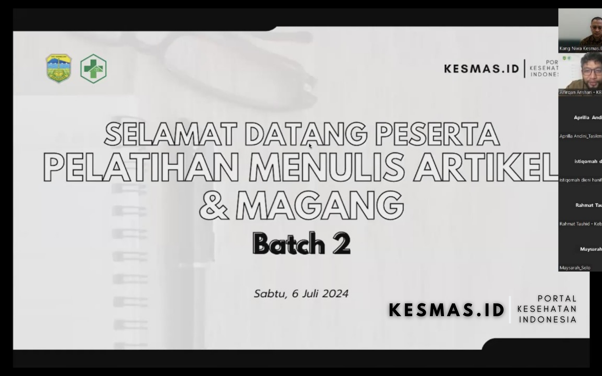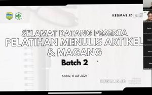 Sabtu, 6 Juli 2024 Kesmas.id bekerjasama dengan Dinas Kesehatan Kabupaten Tasikmalaya membuka kelas penulisan artikel serta magang batch 2 melalui zoom meeting. Kesempatan berharga saya bisa ikut dalam kegiatan ini berkenalan dengan Kang Niwa yang merupakan pimpinan redaksi Kesmas.id memberikan materi seputar penulisan artikel dan implementasinya dalam dunia digital. Penyampaian materi yang rapi dan mudah dipahami membantu saya dalam memulai menulis artikel ini, beliau berharap dengan berjalannya magang selama 3 bulan ini semua peserta magang memiliki keterampilan menulis dan menghasilkan portofolio kepenulisan yang baik.