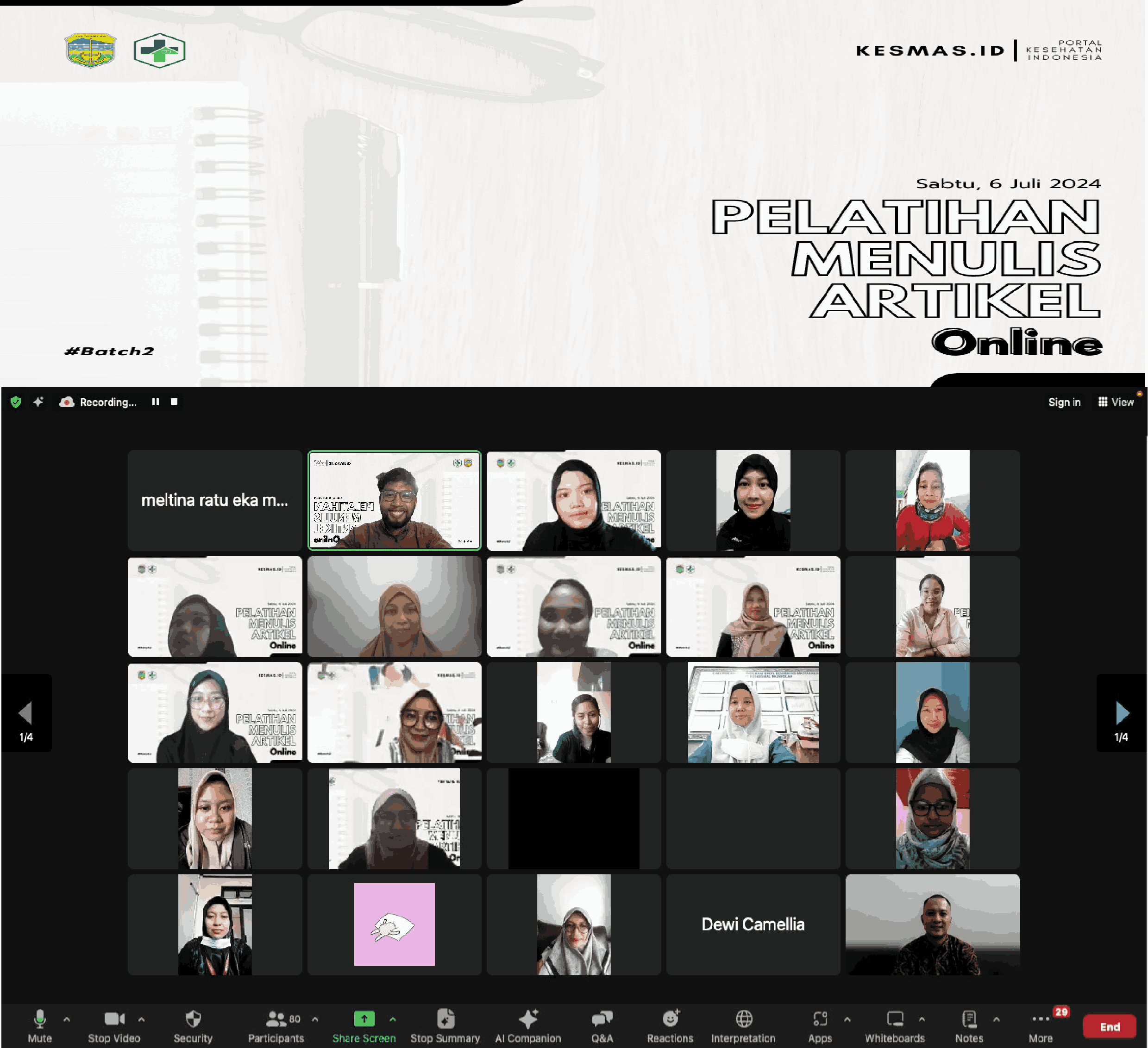 Salah satu upaya dalam meningkatkan skill menulis yaitu dengan mengikuti pelatihan, salah satunya yang diadakan oleh KESMAS.ID. Pelatihan ini diadakan selama 3 bulan dengan sistem magang, peserta berjumlah 50 orang, dimulai hari Sabtu, tanggal 6 Juli 2024. Menariknya, pelatihan ini bekerjasama dengan Dinas Kesehatan dan Puskesmas Kabupaten Tasikmalaya. Hal ini menguatkan fokus tema pelatihan yaitu tentang kesehatan dan jalannya pelatihan juga dapat dibimbing oleh piham yang berkompeten dalam bidangnya.