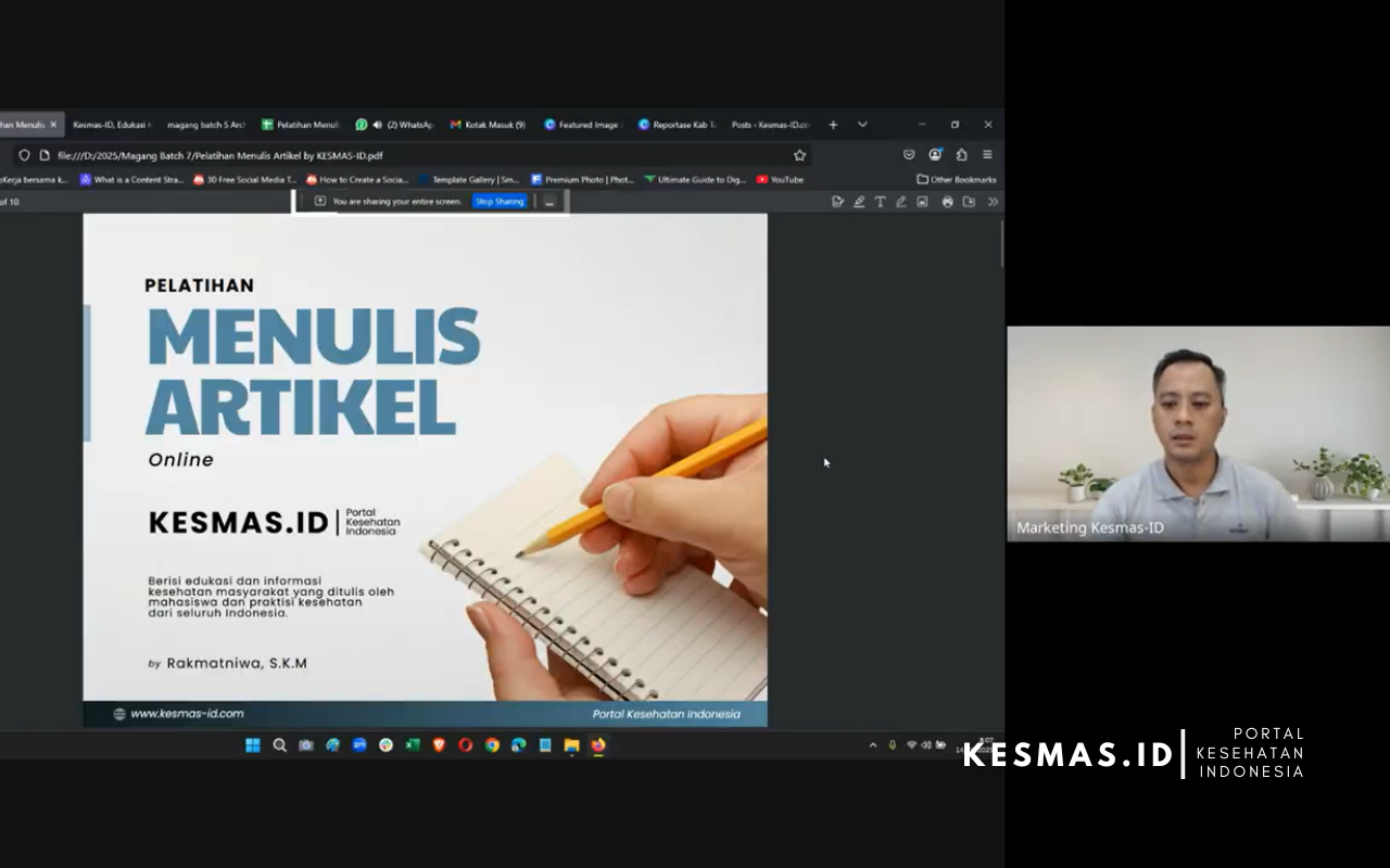 Materi kedua secara spesifik disampaikan oleh Kak Anis dengan topik Menulis Artikel Populer Kesehatan. Dalam sesi ini, saya bersama peserta lainnya dibimbing untuk memahami teknik menulis artikel kesehatan yang menarik, informatif, dan mudah dipahami oleh pembaca. Kami juga berlatih menyusun kepala berita (lead) berdasarkan bahan artikel dari batch sebelumnya, kemudian mendapatkan masukan langsung dari Kak Anis. Selain itu, Kak Anis turut mempraktikkan secara langsung bagaimana proses publikasi artikel di website Kesmas ID, termasuk bagaimana mengatur SEO agar artikel mudah diakses.